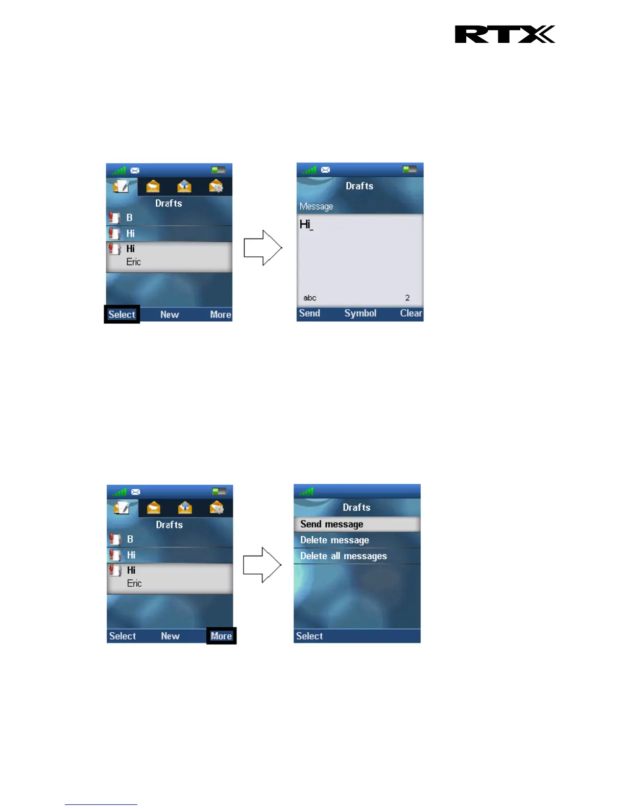 To write a new message press the middle softkey ‘New’ in this ‘Drafts’ menu (this function is described