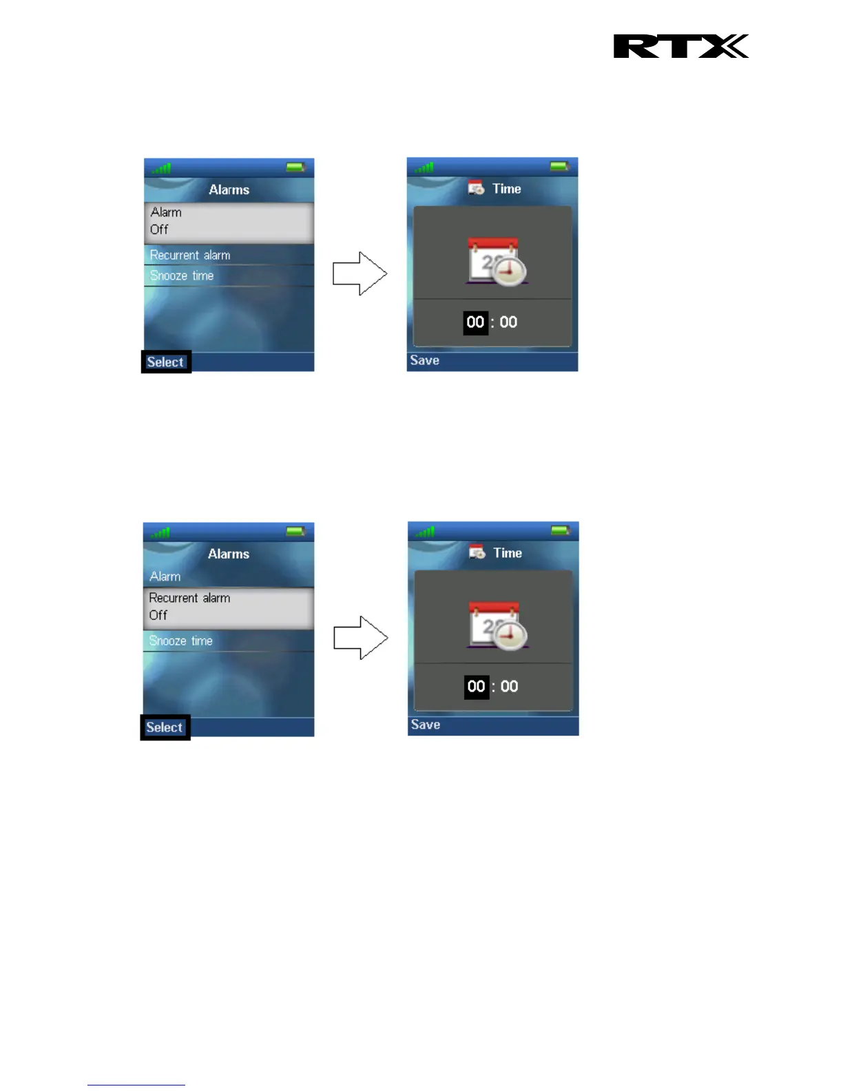 When “Alarm” is selected it is possible to set a time for an alarm to occur, and then press left softkey