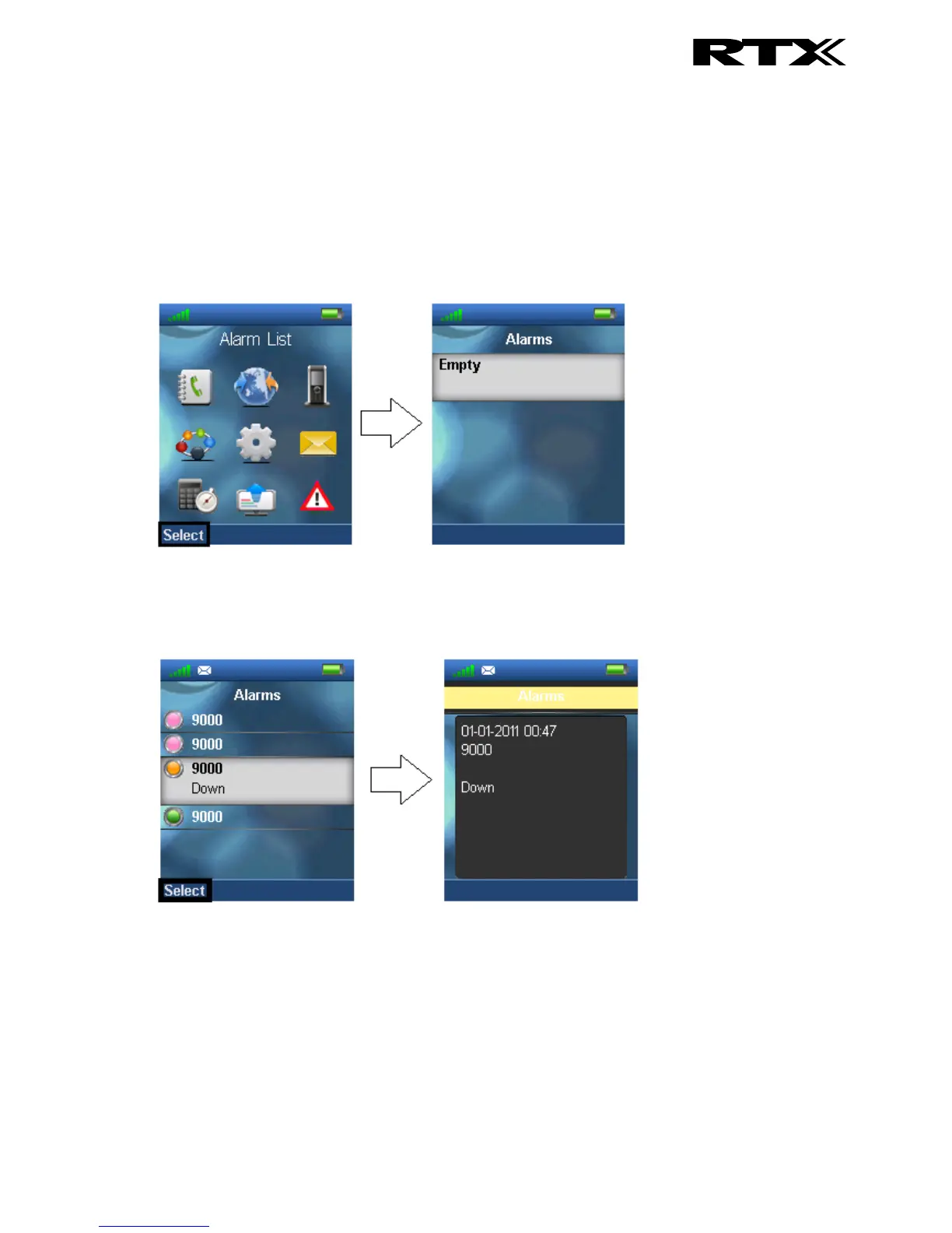 If any alarms has been received on the handset these is displayed in the “Alarms” menu. Additionally,