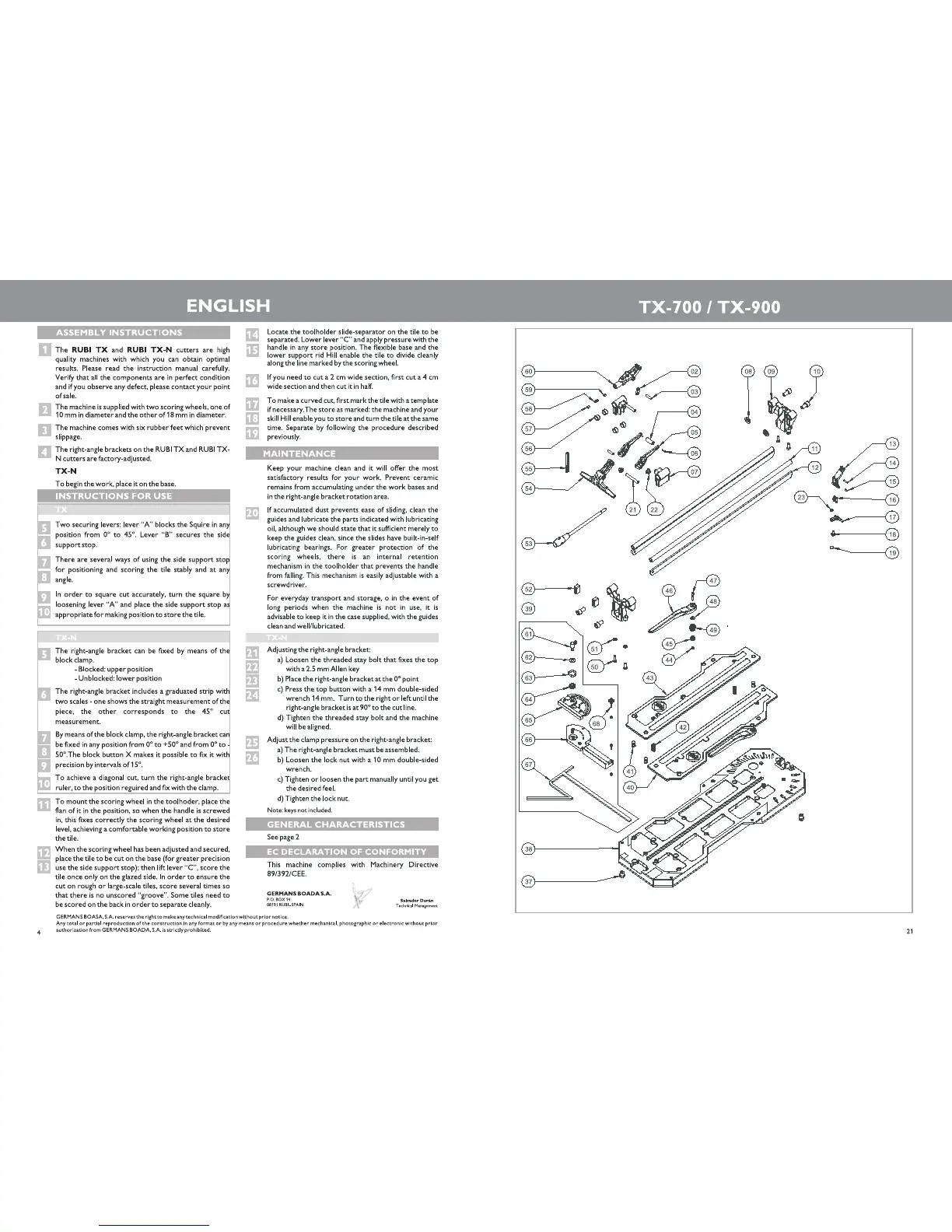 Rubi TX - Assembly Instructions; Instructions for Use; Maintenance; General Characteristics