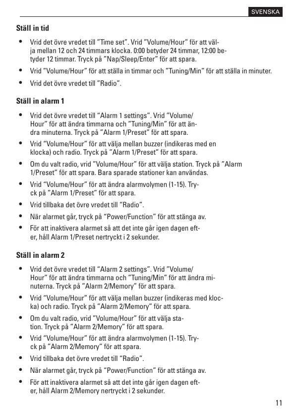 klocka) och radio. Tryck på ”Alarm 1/Preset” för att spara.