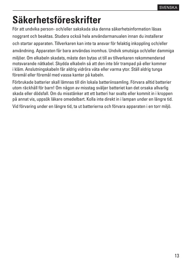 användning. Apparaten får bara användas inomhus. Undvik smutsiga och/eller dammiga