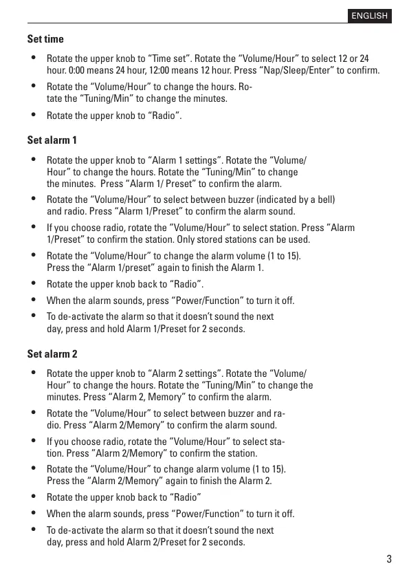 and radio. Press “Alarm 1/Preset” to conrm the alarm sound.