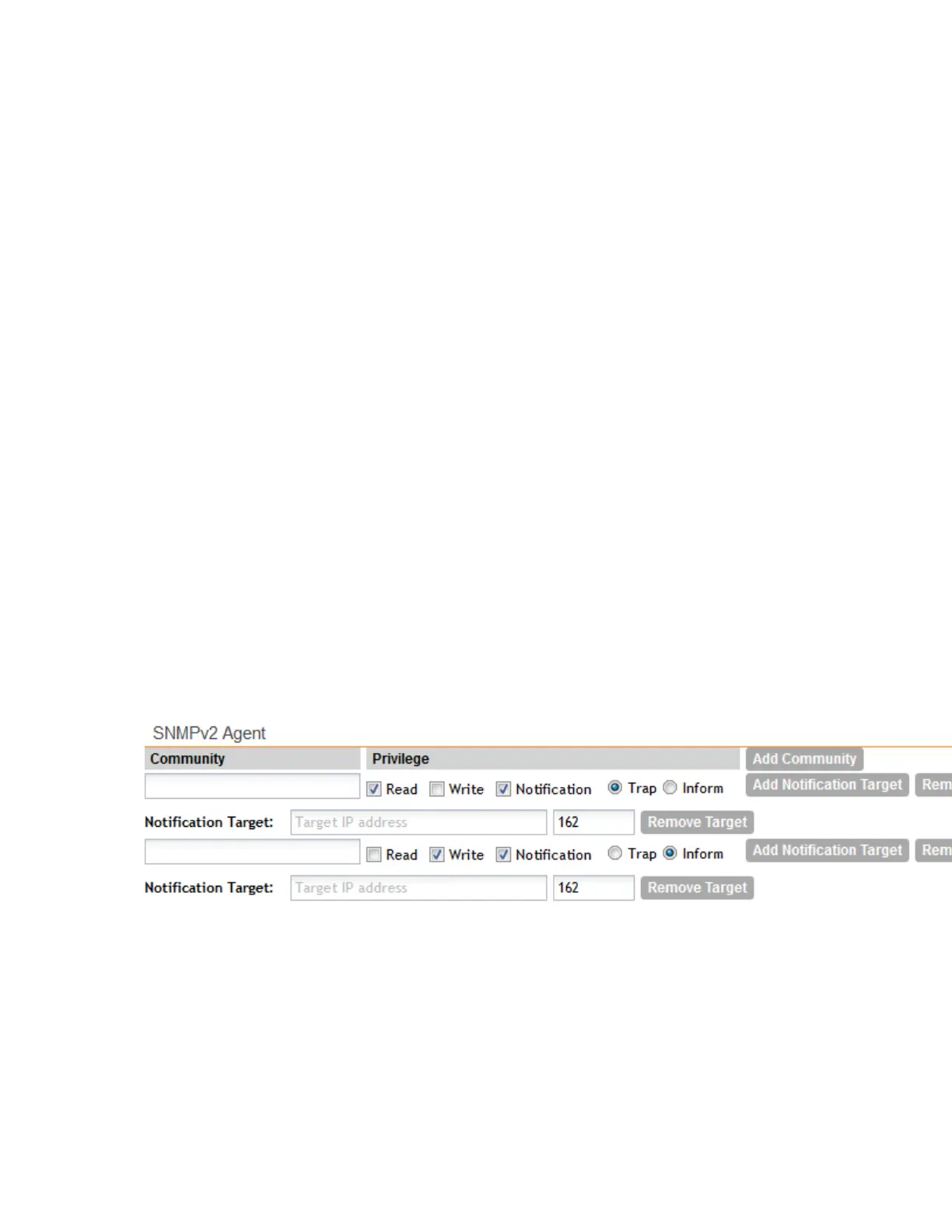 • Trap: Select this privilege if you want to send SNMP trap notifications for this community.