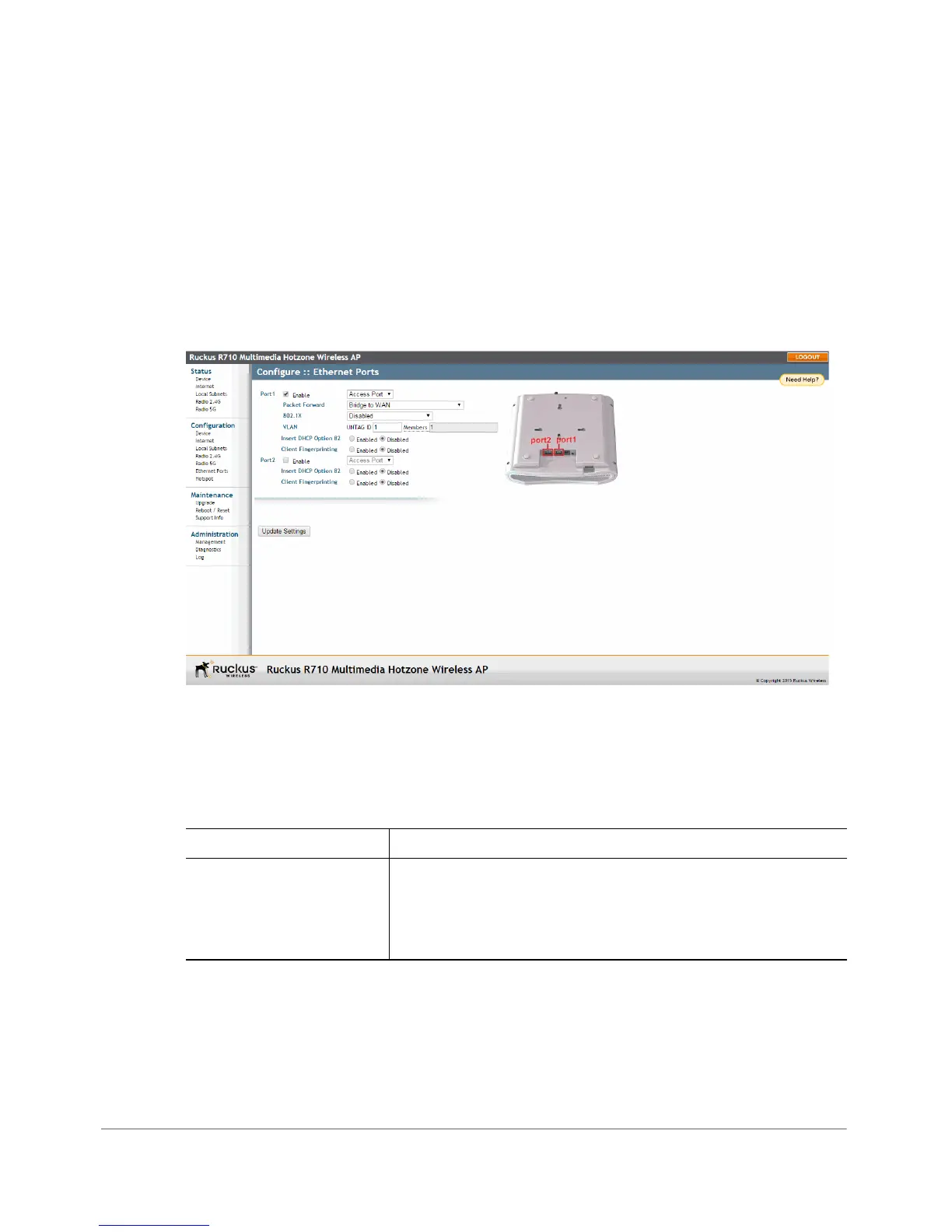 The Ethernet Ports configuration page allows you to define how the AP’s Ethernet
