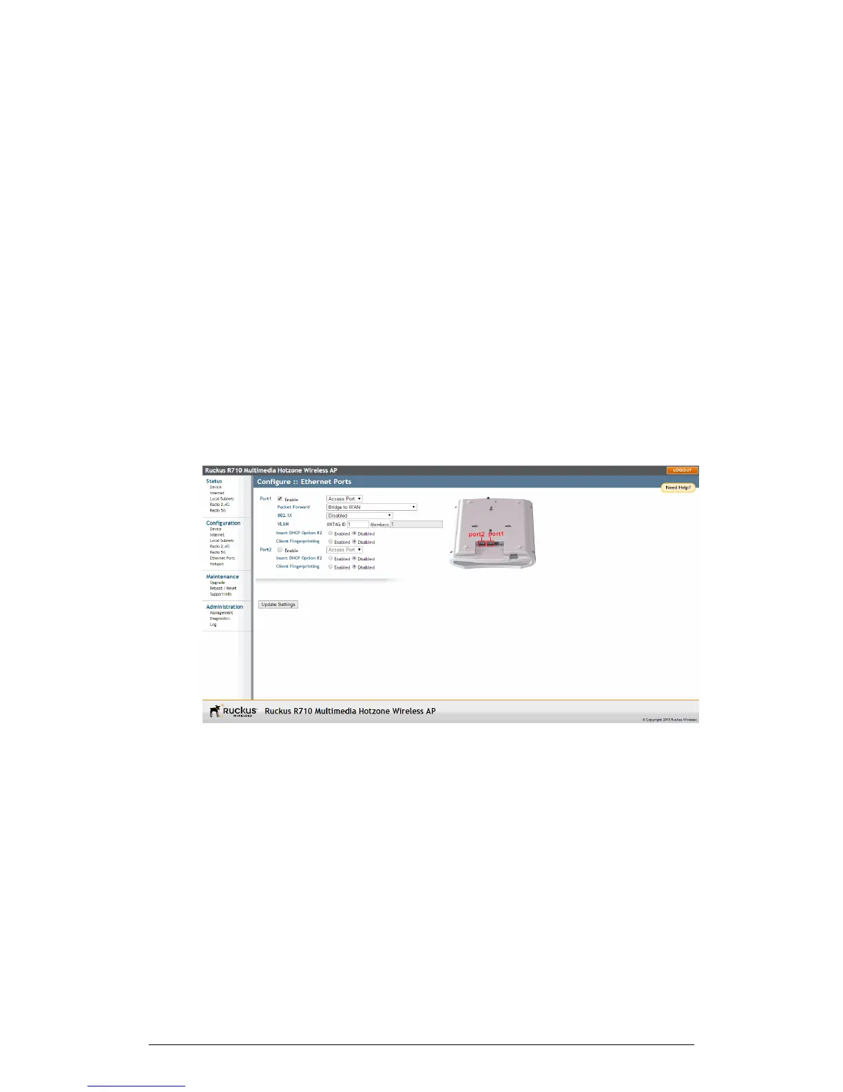 The Ethernet Ports configuration page allows you to define how the AP's Ethernet ports