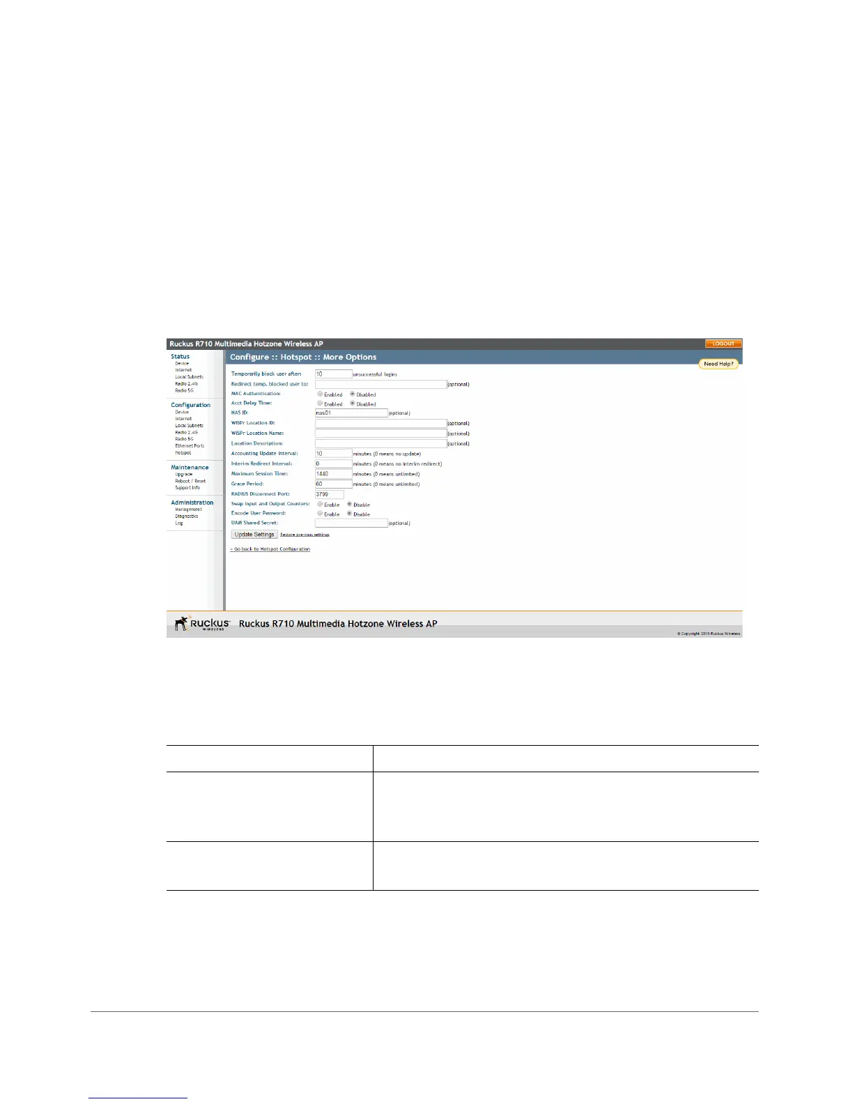 The Ta b l e 54 Hotspot options can be configured from the Configuration > Hotspot