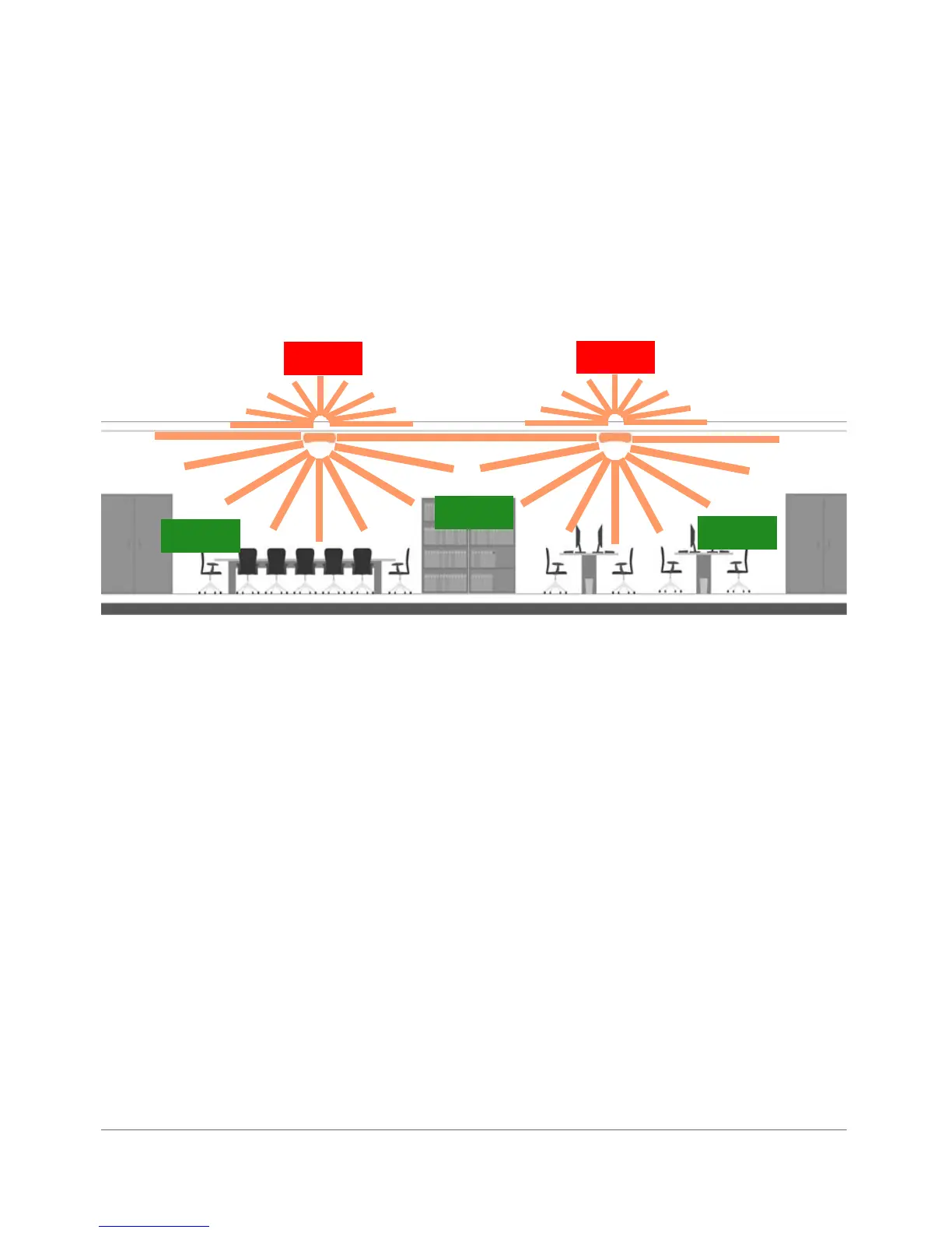 rounded coverage area and less horizontal range (when mounted horizontally)