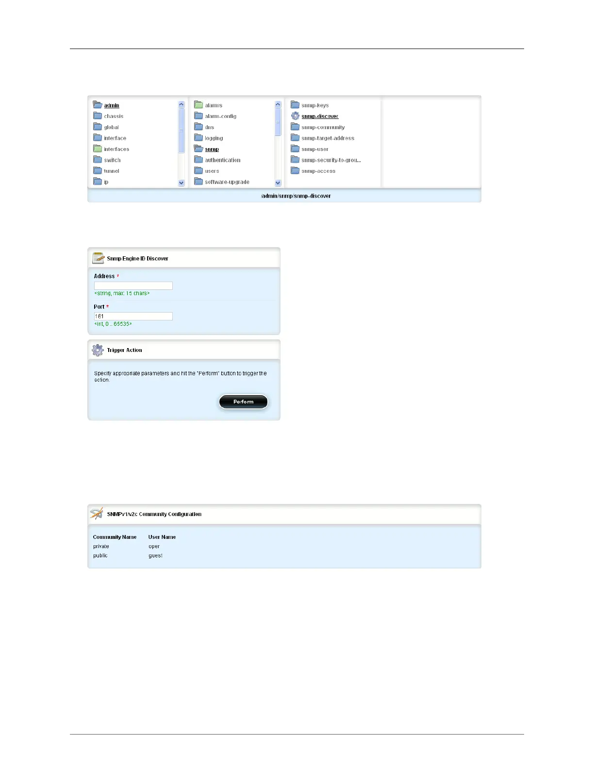 SNMP Engine ID Discover form, enter parameters in the fields. On the Trigger Action form, click Perform.