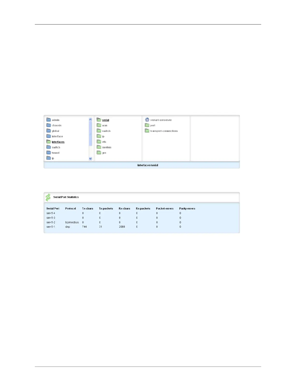 To display the Serial Port Statistics table, navigate to interfaces/serial/port.