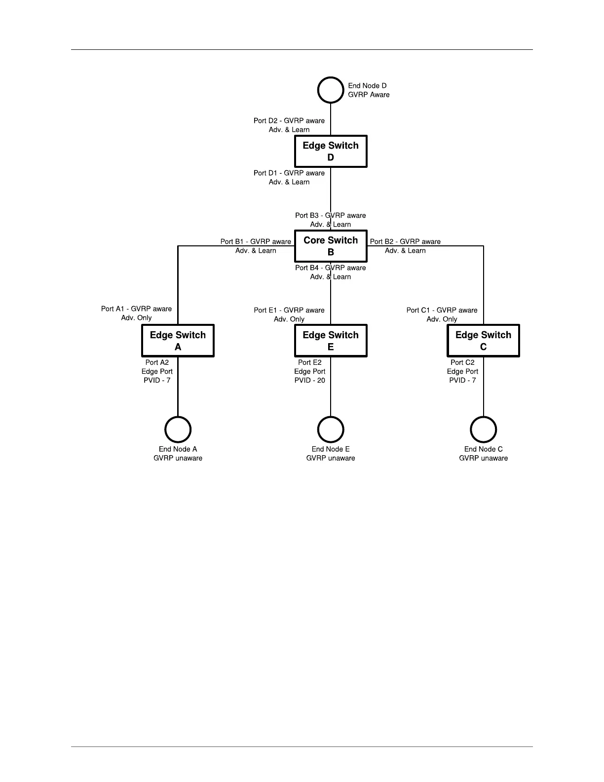 • End Node D is GVRP aware and is interested in VLAN 20, hence VLAN 20 is advertised by it towards