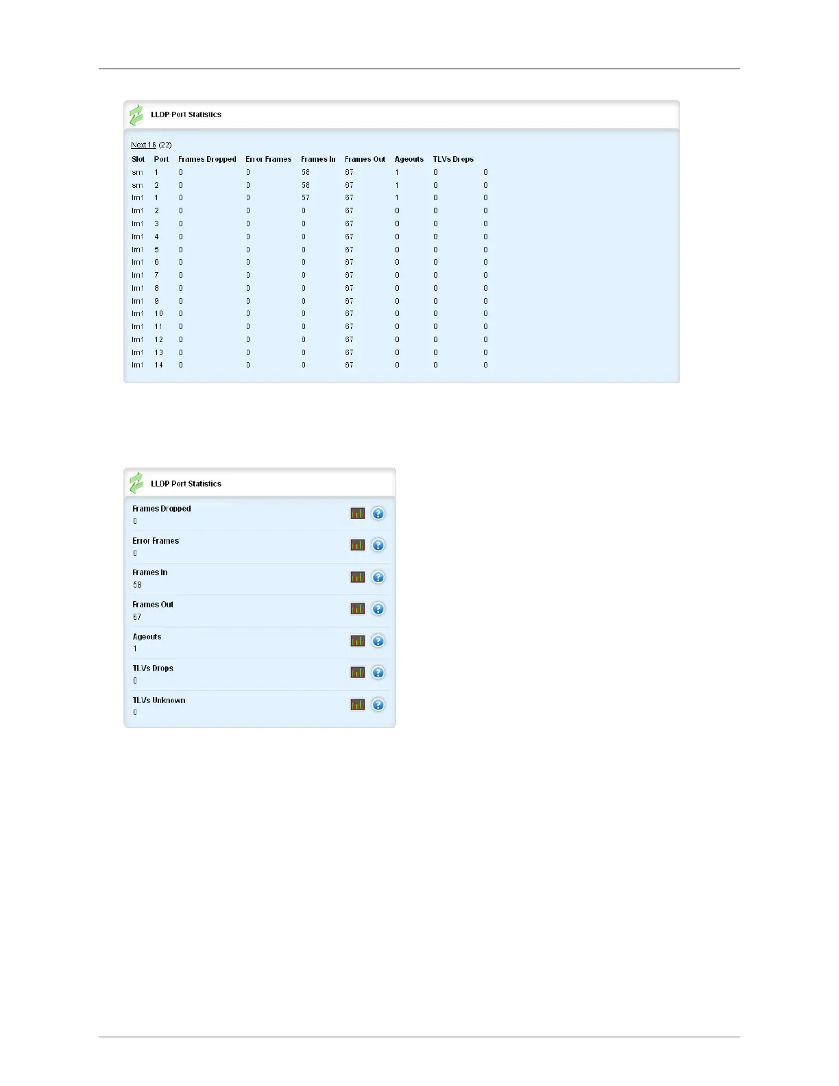 The LLDP Port Statistics table allows you to view port LLDP statistics