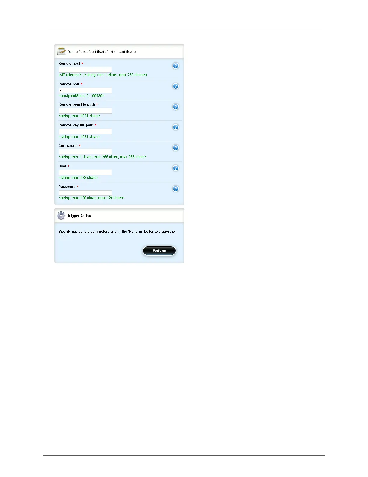 certificates, enter the parameters and then click the Perform button.