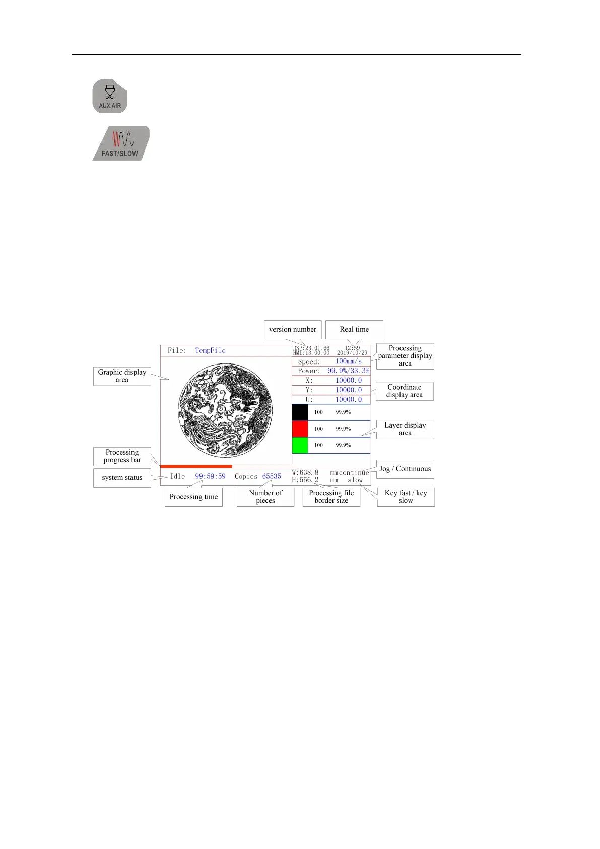 Processing parameter display area:Display the file number, speed and maximum