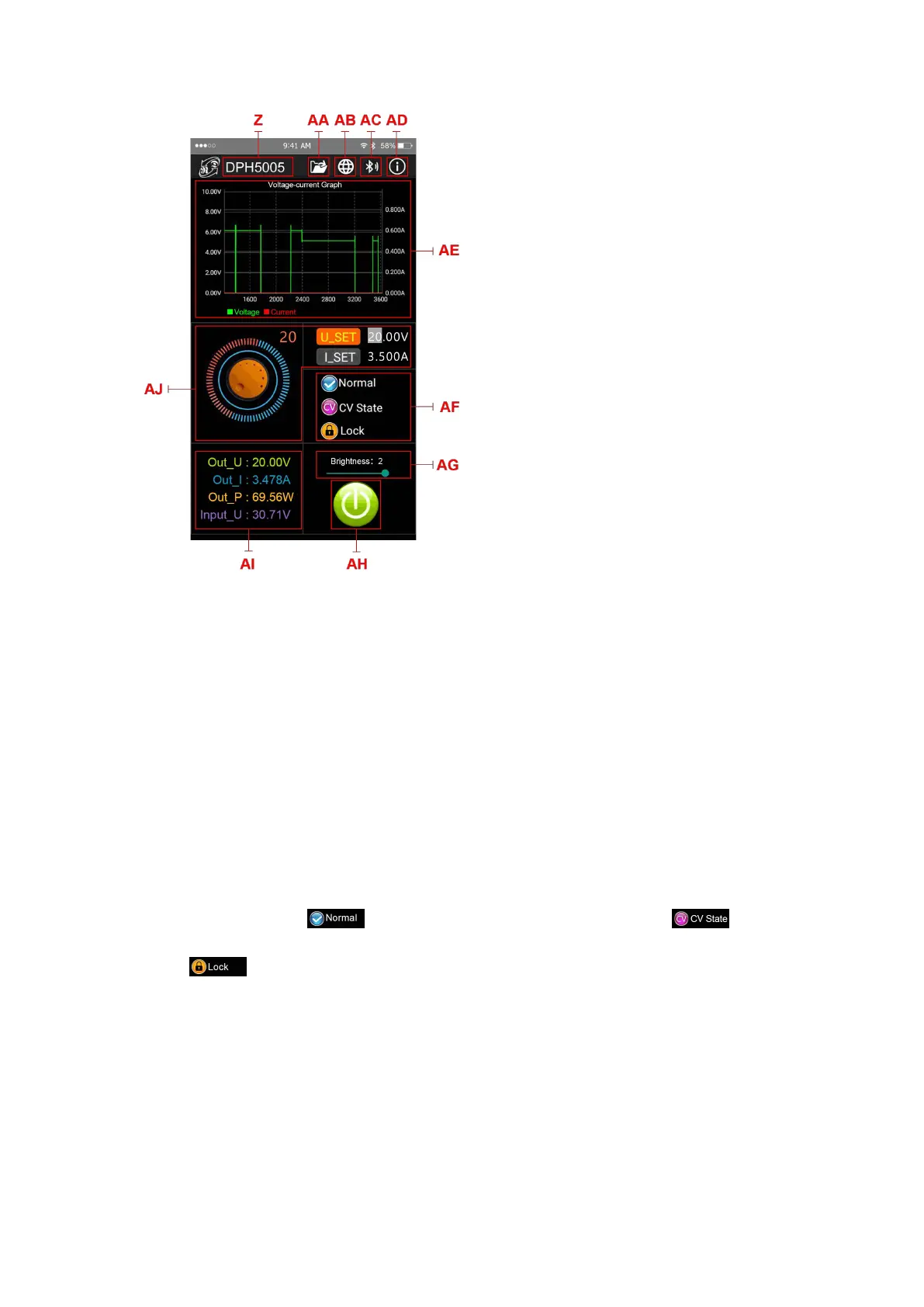 AJ: value of preset output voltage, output current, select U_SET or I_SET, turn the