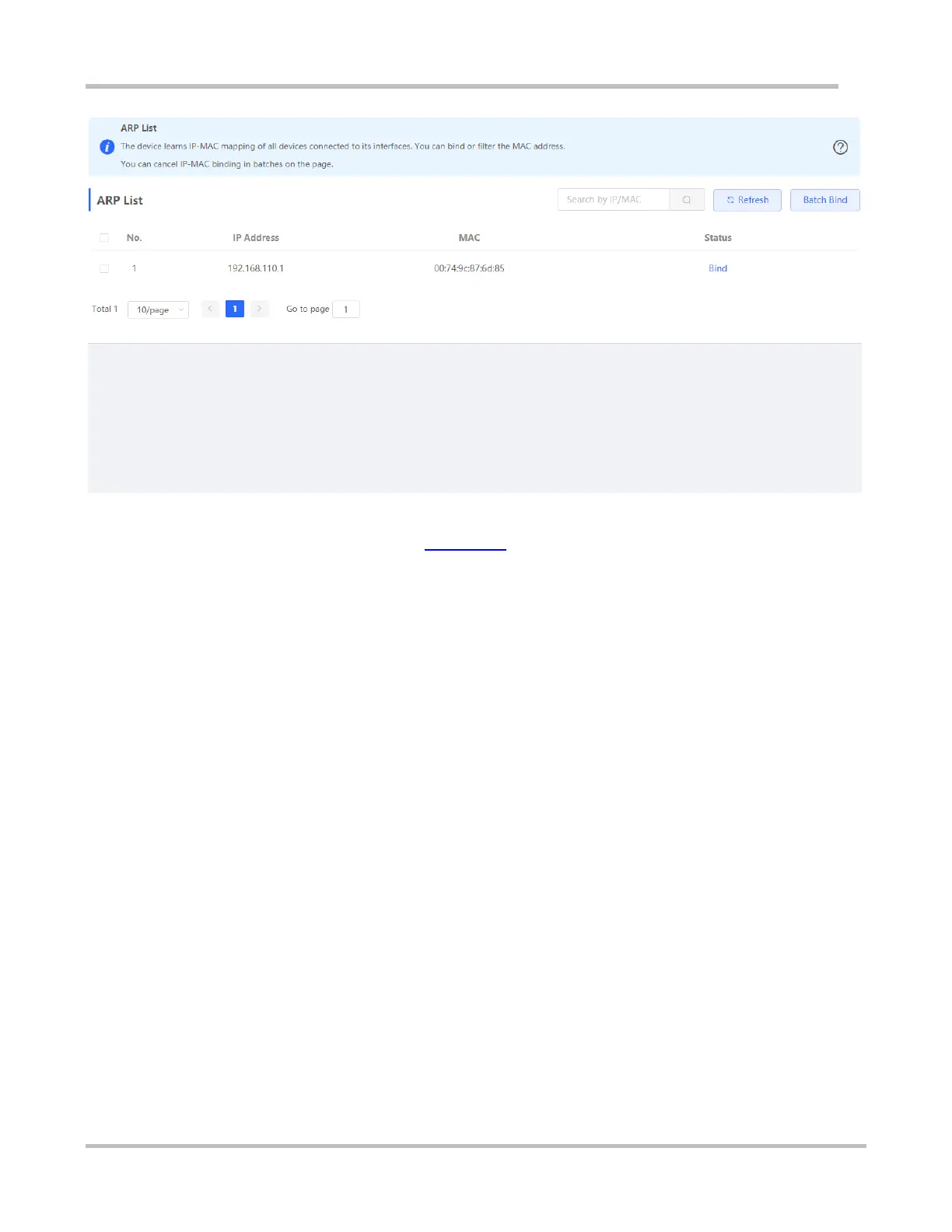 Click Bind in the Action column to bind an IP address with a MAC address. Alternatively, select ARP entries and click Batch