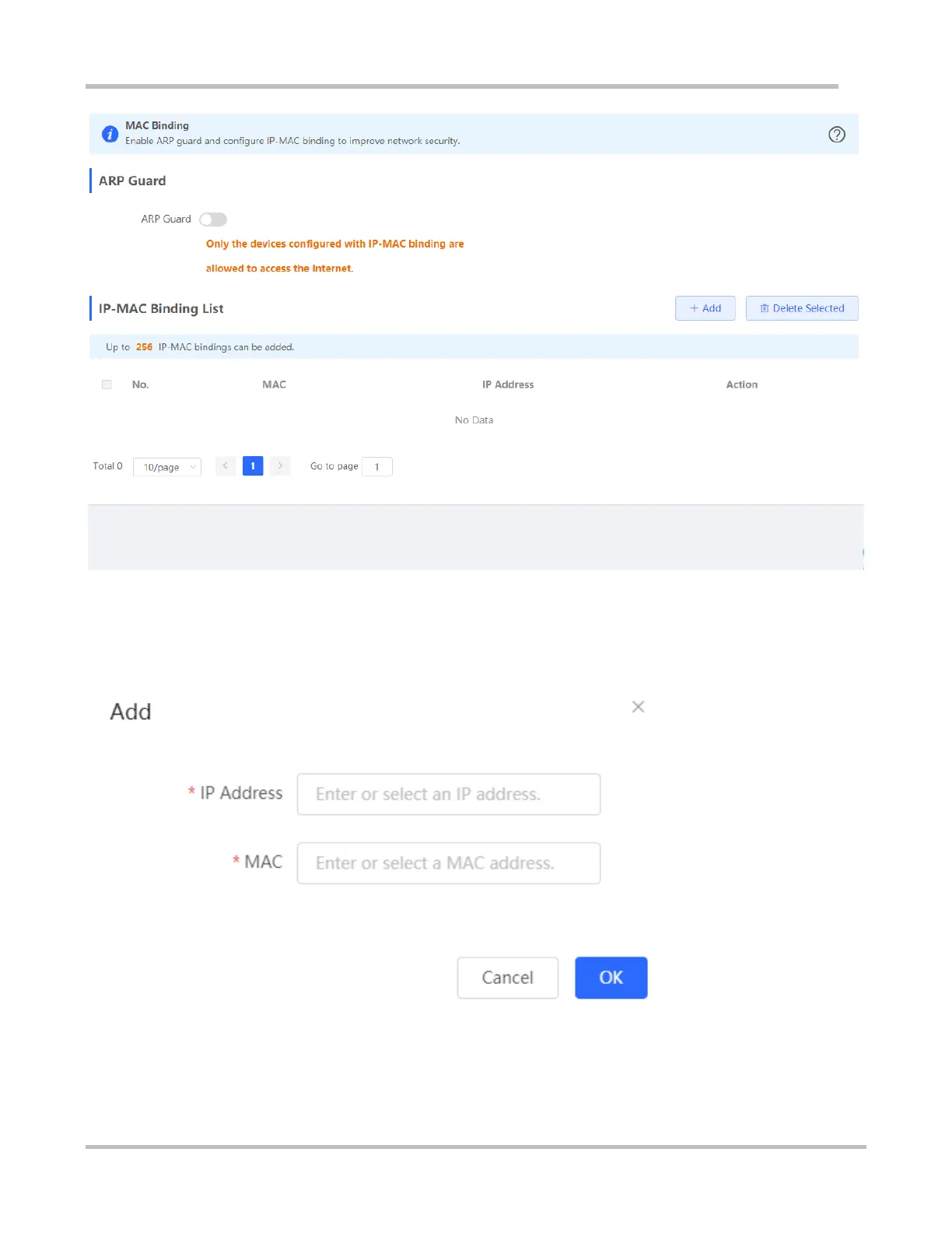 Click Add to add an IP-MAC binding. In the displayed dialog box, enter or select an IP address and a MAC address and click