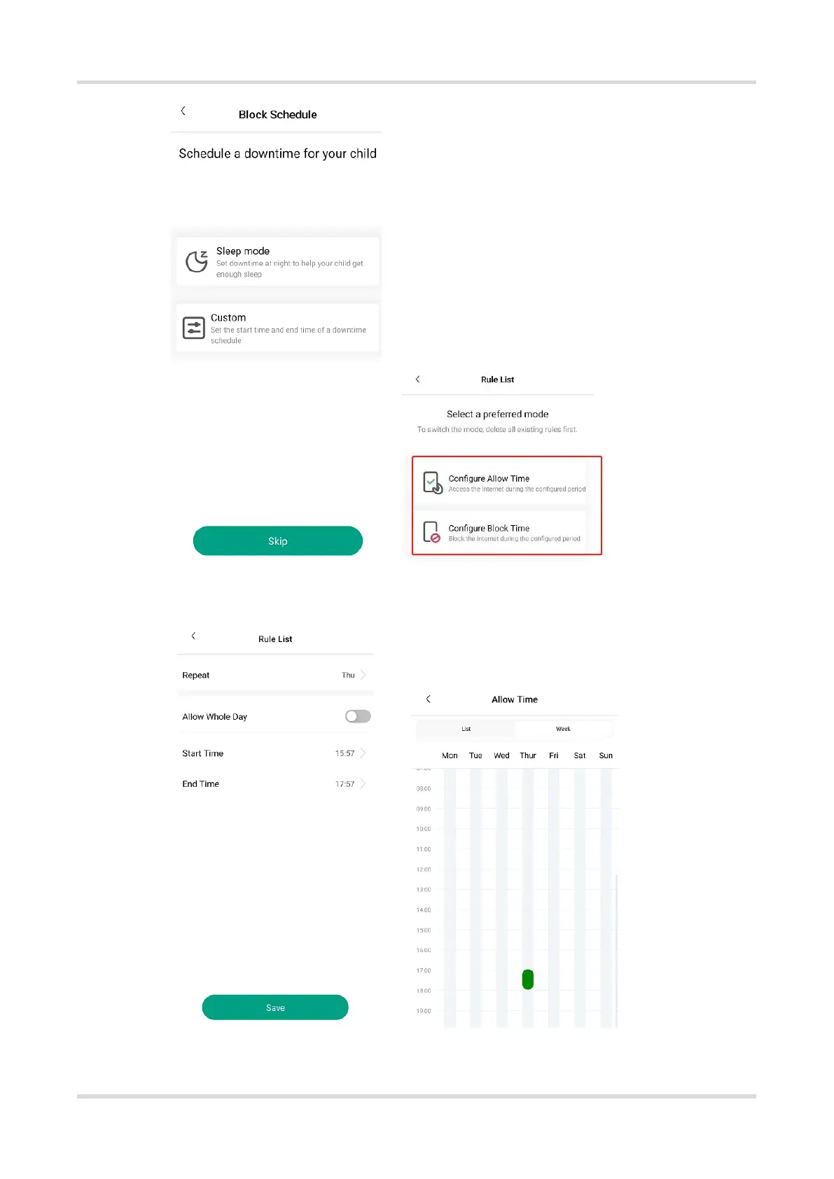 d Select a mode, configure the start time and end time for a rule, and tap Save. The schedule will be