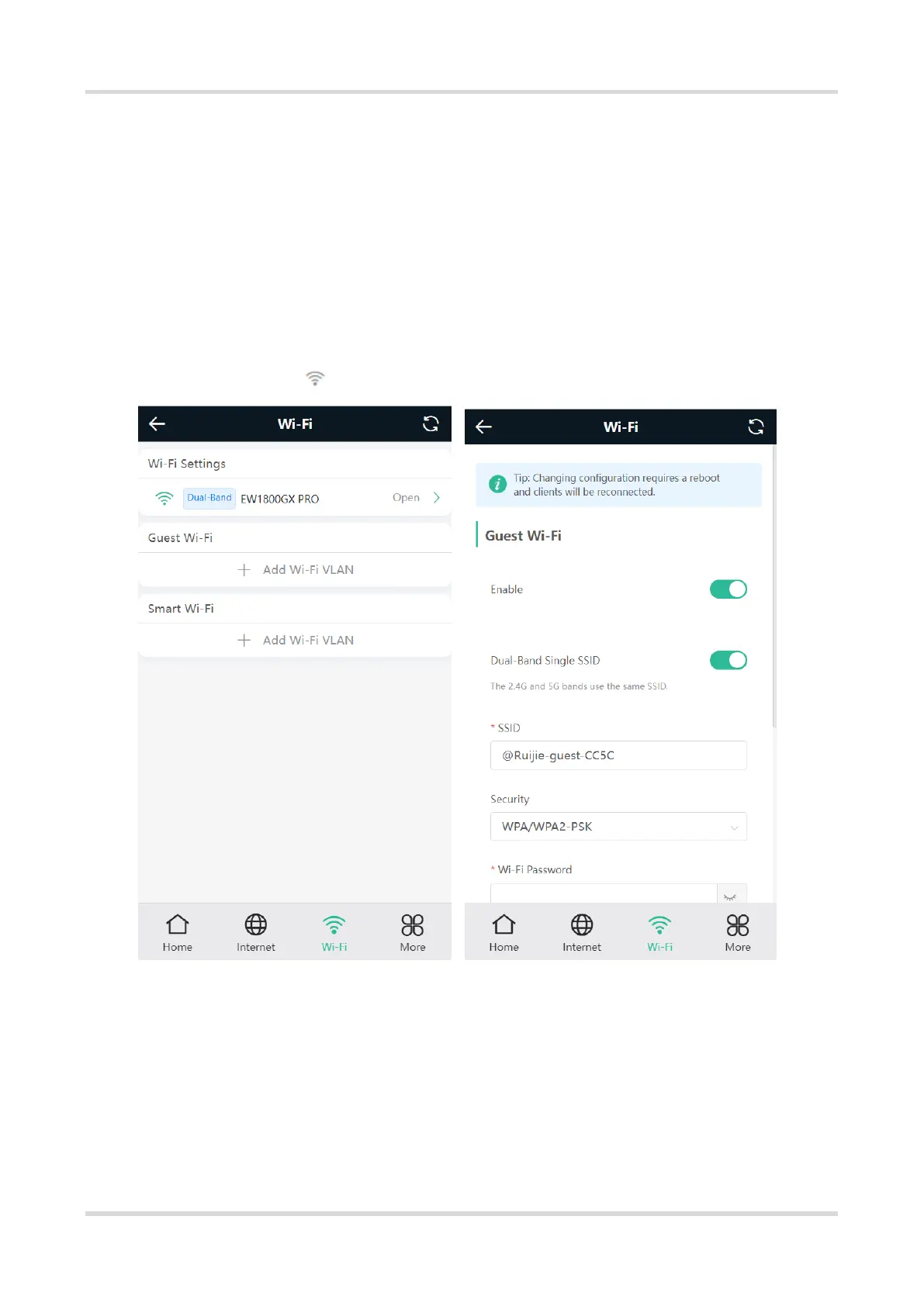 PC View: Choose More > WLAN > Wi-Fi > Wi-Fi Settings/Guest Wi-Fi/Smart Wi-Fi.