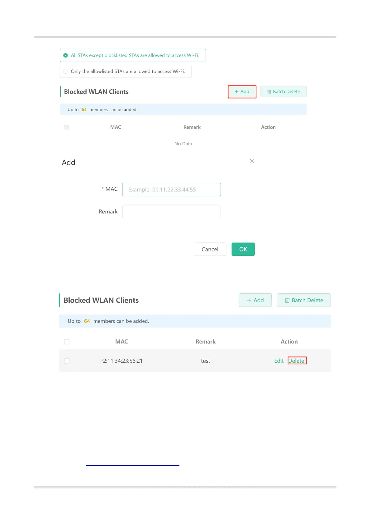 (2) Click Delete. The client can connect to the Wi-Fi network again.