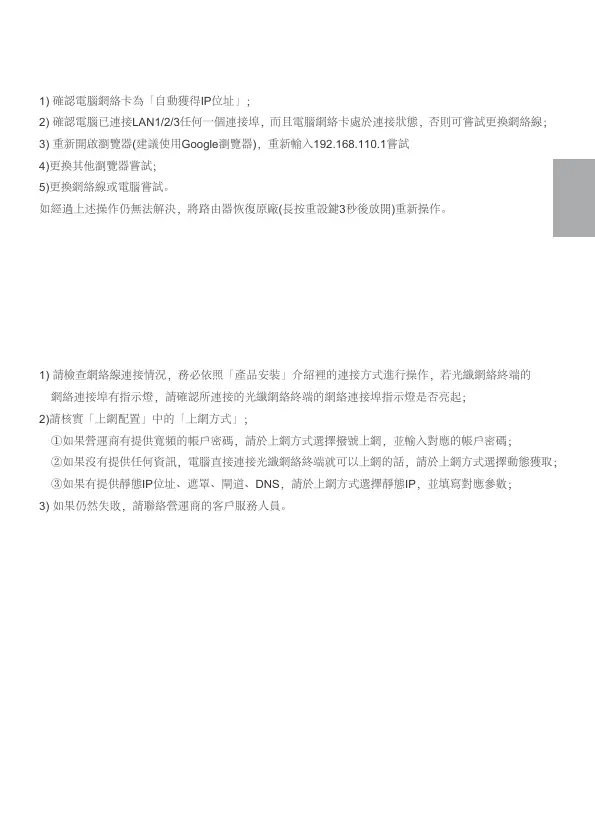 1) 請檢查網絡線連接情況,務必依照「產品安裝」介紹裡的連接方式進行操作,若光纖網絡終端的