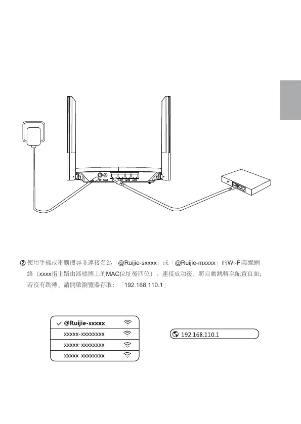 使用手機或電腦搜尋並連接名為「@Ruijie-sxxxx」或「@Ruijie-mxxxx」的Wi-Fi無線網