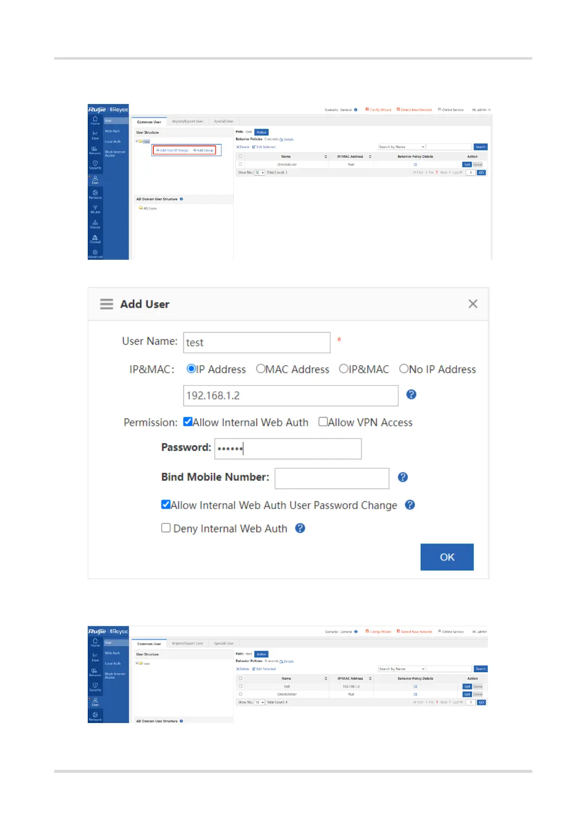 (2) Add a user to be authenticated: Click a user group in the user organization on the left, add a user (IP range)