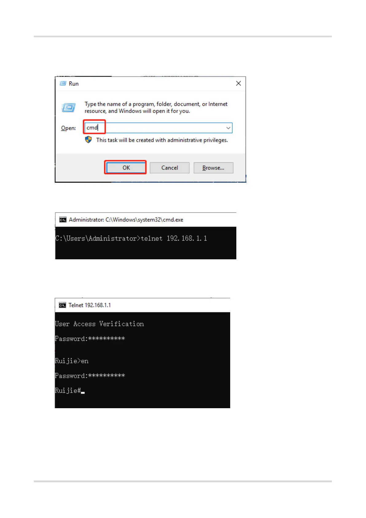 (2) Enter the telnet IP address of the router’s interface command and press Enter.
