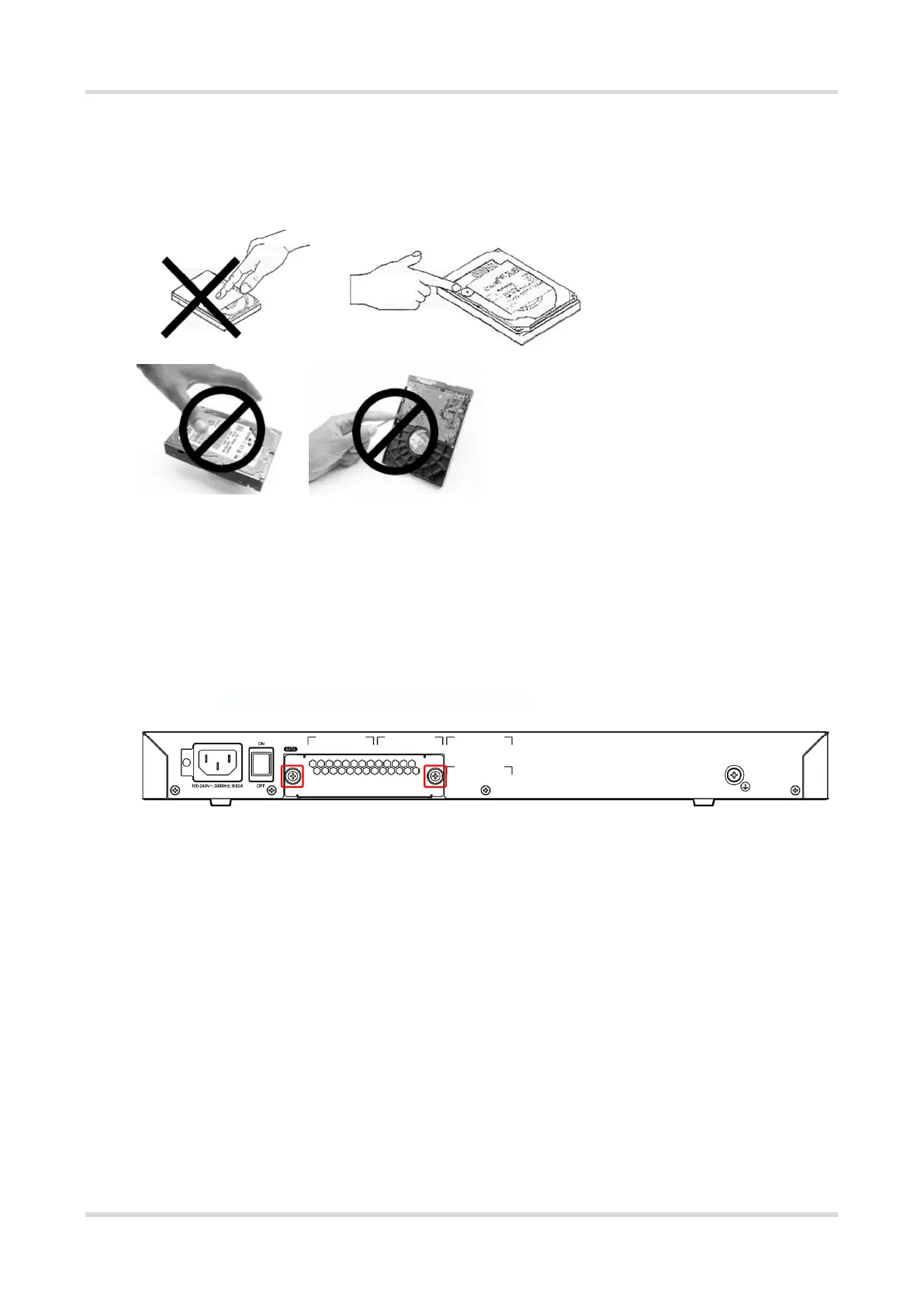 (1) Facing the back panel of the device, unscrew the two fixing screws on the hard disk slot cover to remove the