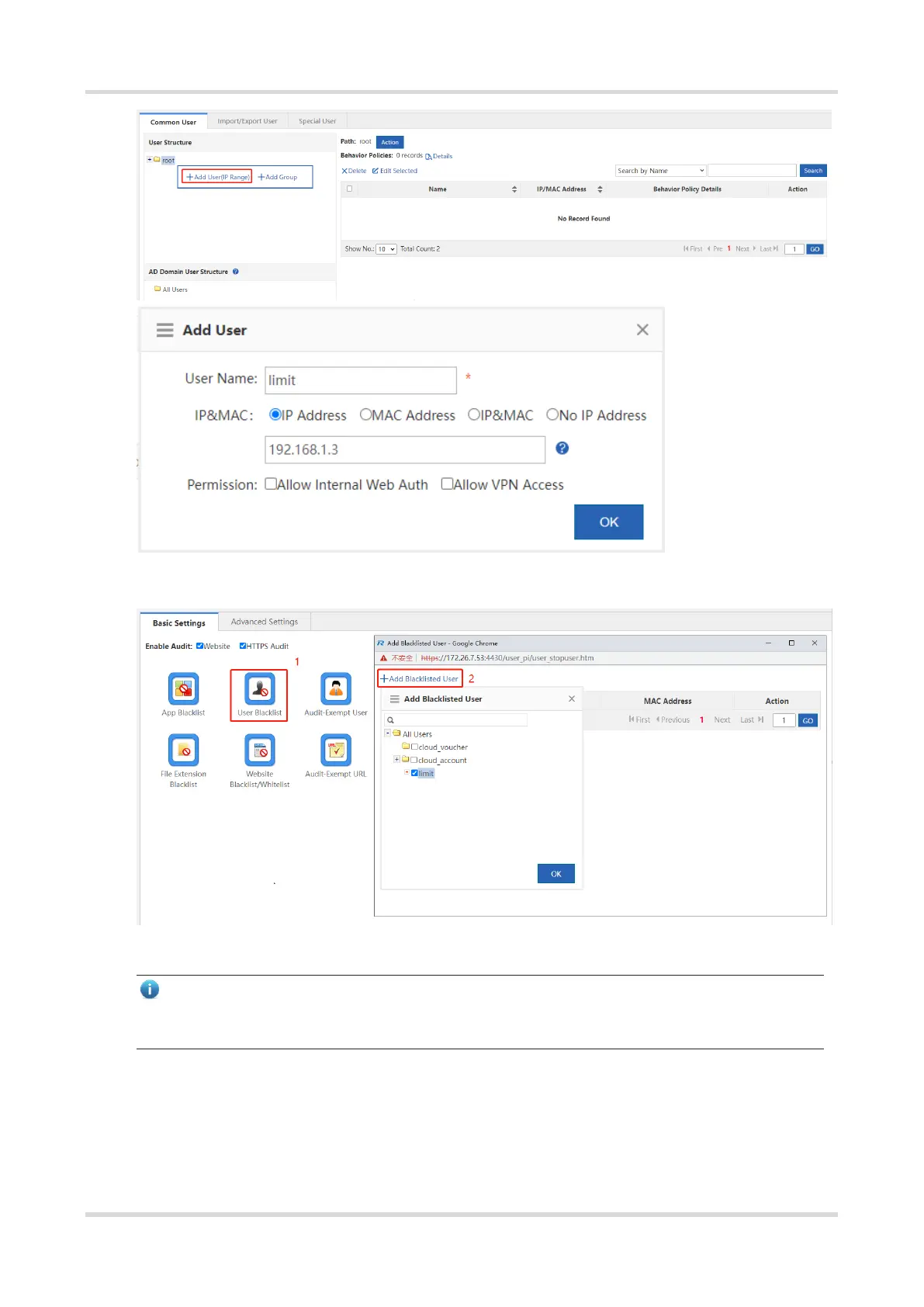 If the IP address of a blacklisted user is added to the audit-exempt user list, all applications of the user are limited