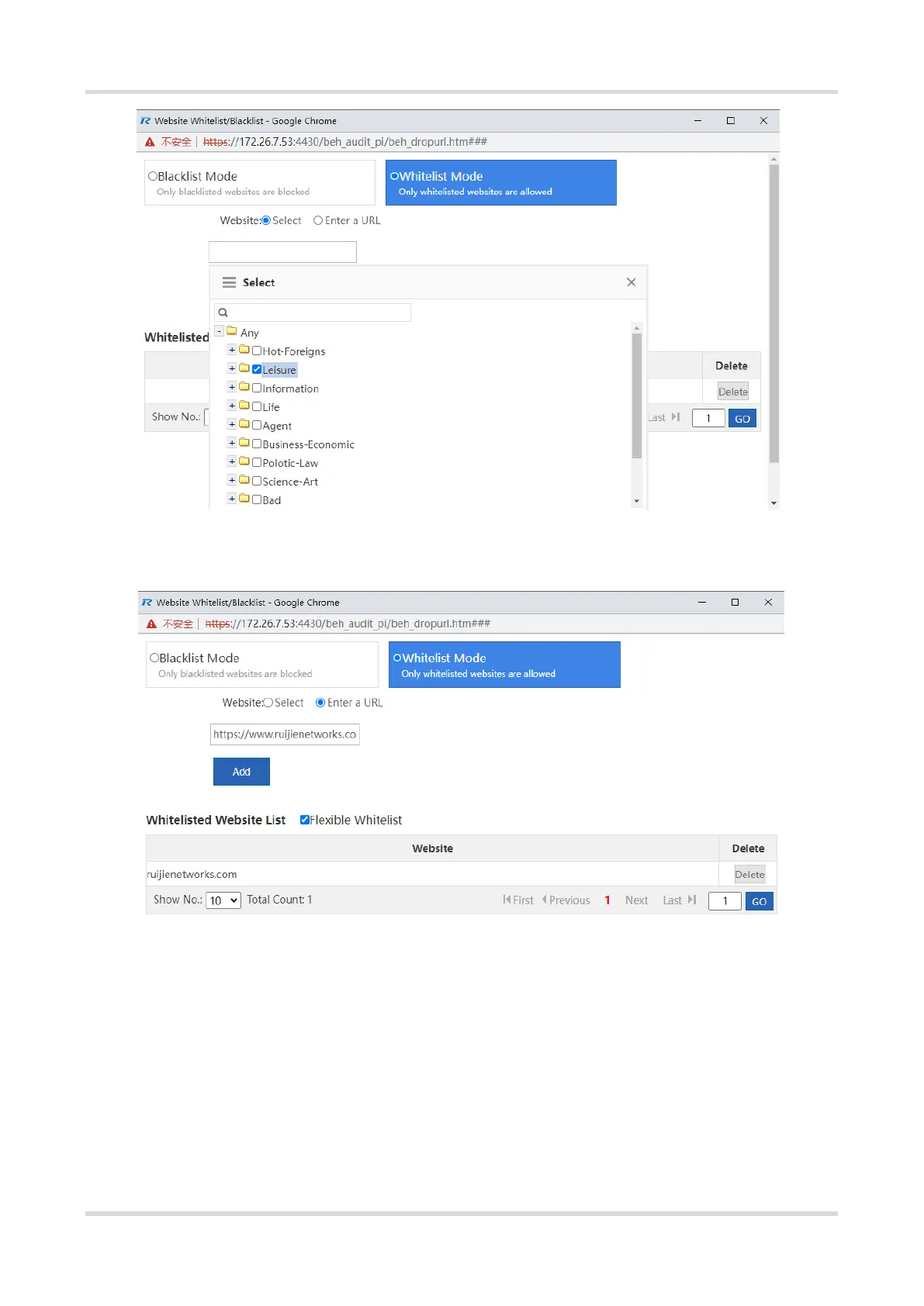 The URL categories displayed after selecting Select are default ones of the device. Alternatively, you can click