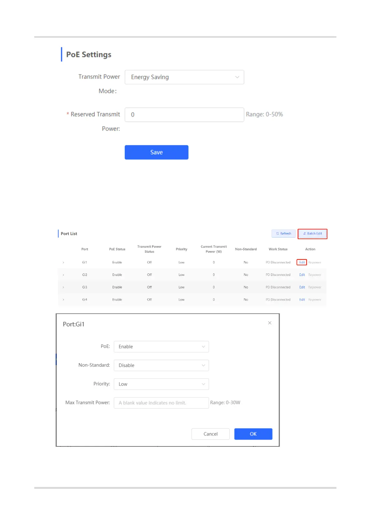 Click Edit in the port entry or click Batch Edit to set the PoE power supply function of the port.