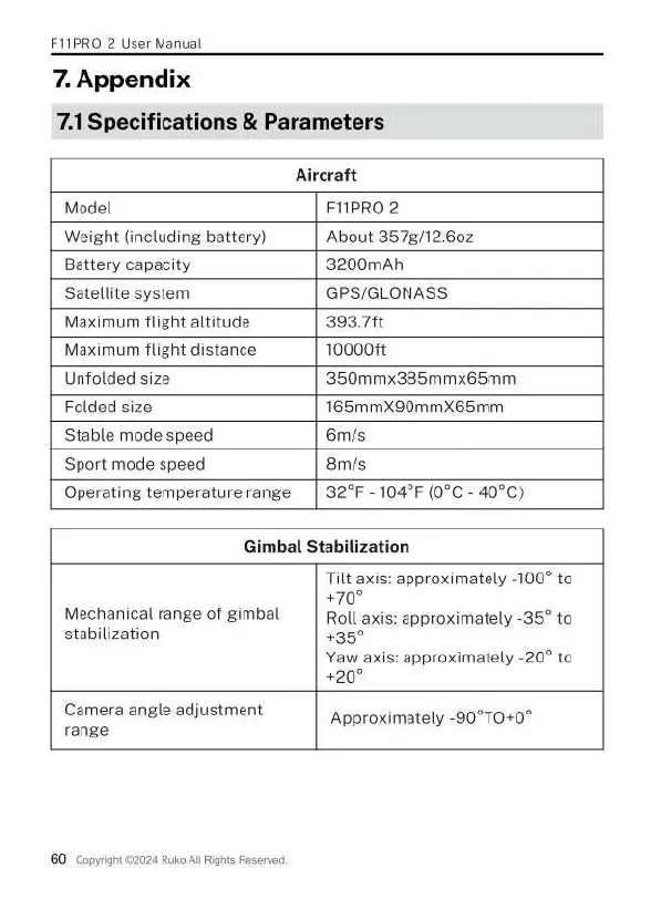 RUKO F11PRO 2 - Appendix; Specifications & Parameters