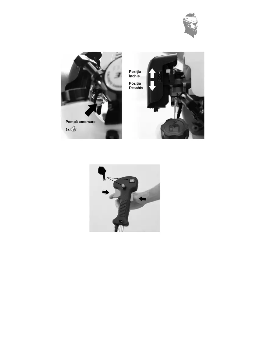 Secure the brushcutter with your left hand and pull the starter string with your right hand.