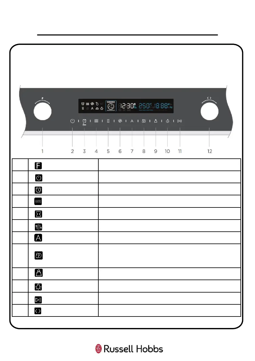 The appliance has an oven function dial, adjustment dial, a display, and function
