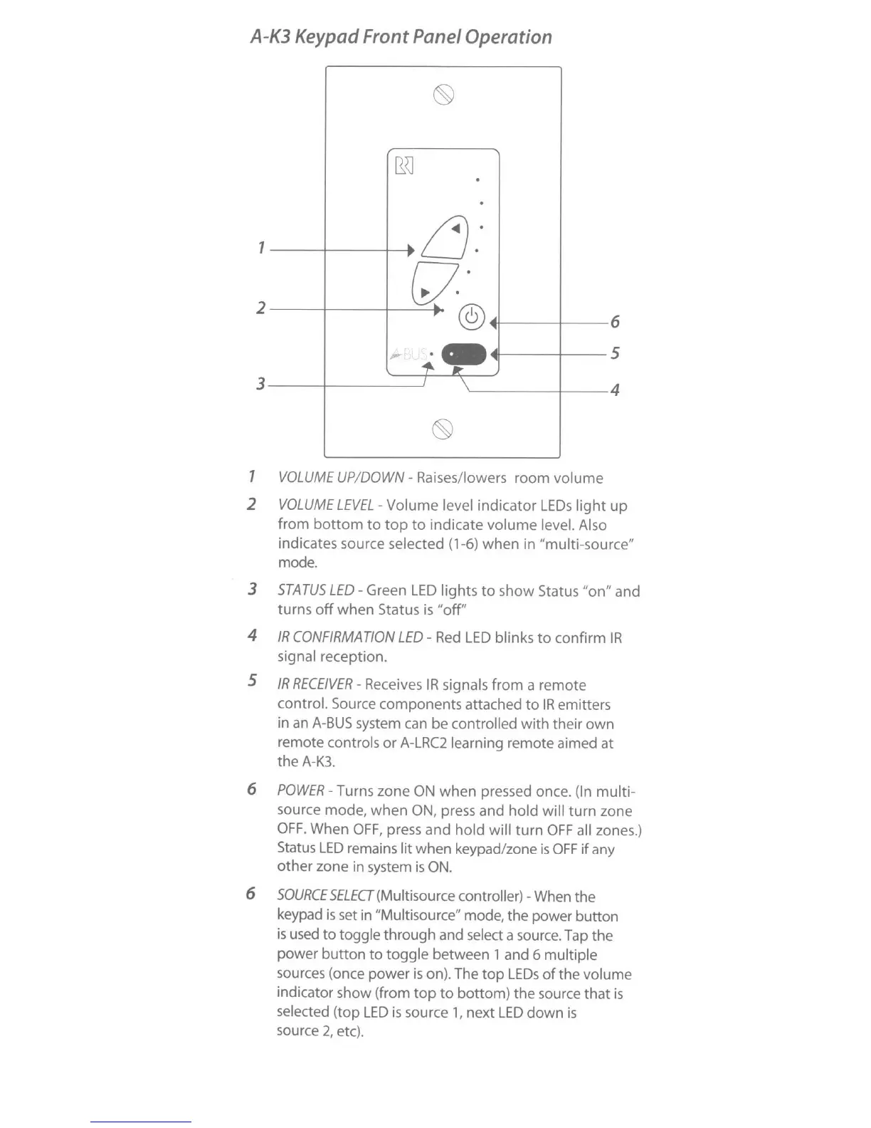 Russound A-K3 - A-K3 Keypad Front Panel Operation; Volume Control and Indication; Status and IR Confirmation LEDs; IR Receiver and Power;Source Select