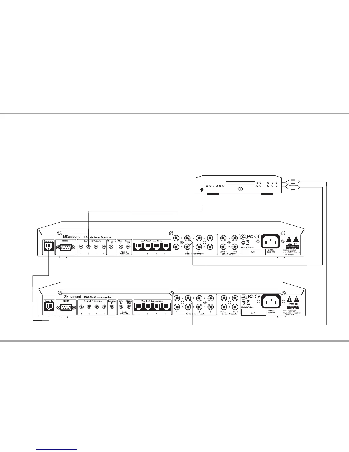 zones and four sources. This setup requires two controllers, a CAT-5 linking