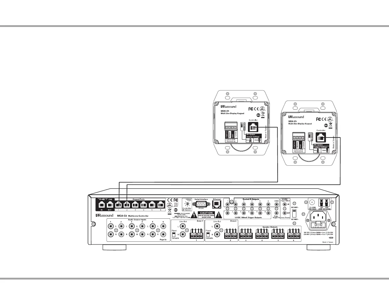 The six keypad ports correspond to the six zones supported by the MCA-C3.