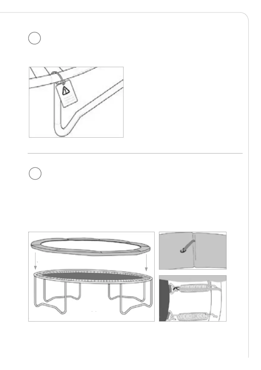 Fest sikkerhetsskiltet (9) på trampolinen med en strips. Stripset skal ligge rundt