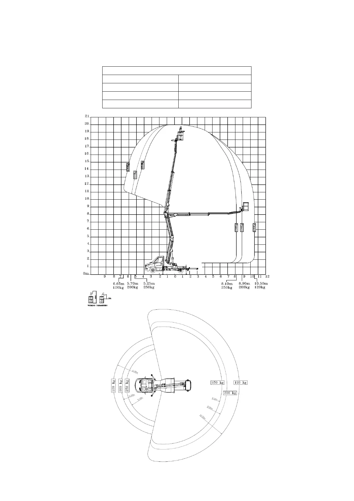 The max basket capacity is 250 kg. The max lateral outreach is: