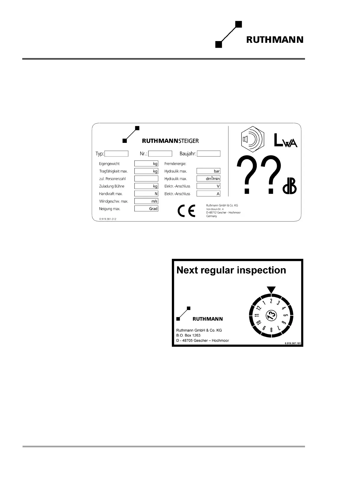 Type plate with CE-mark and indication of acoustic capacity level (Exam-