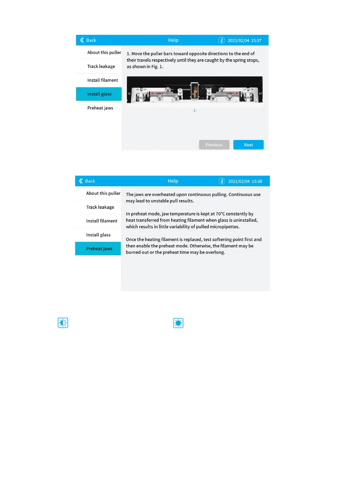 Click to decrease the brightness and click to increase the brightness.