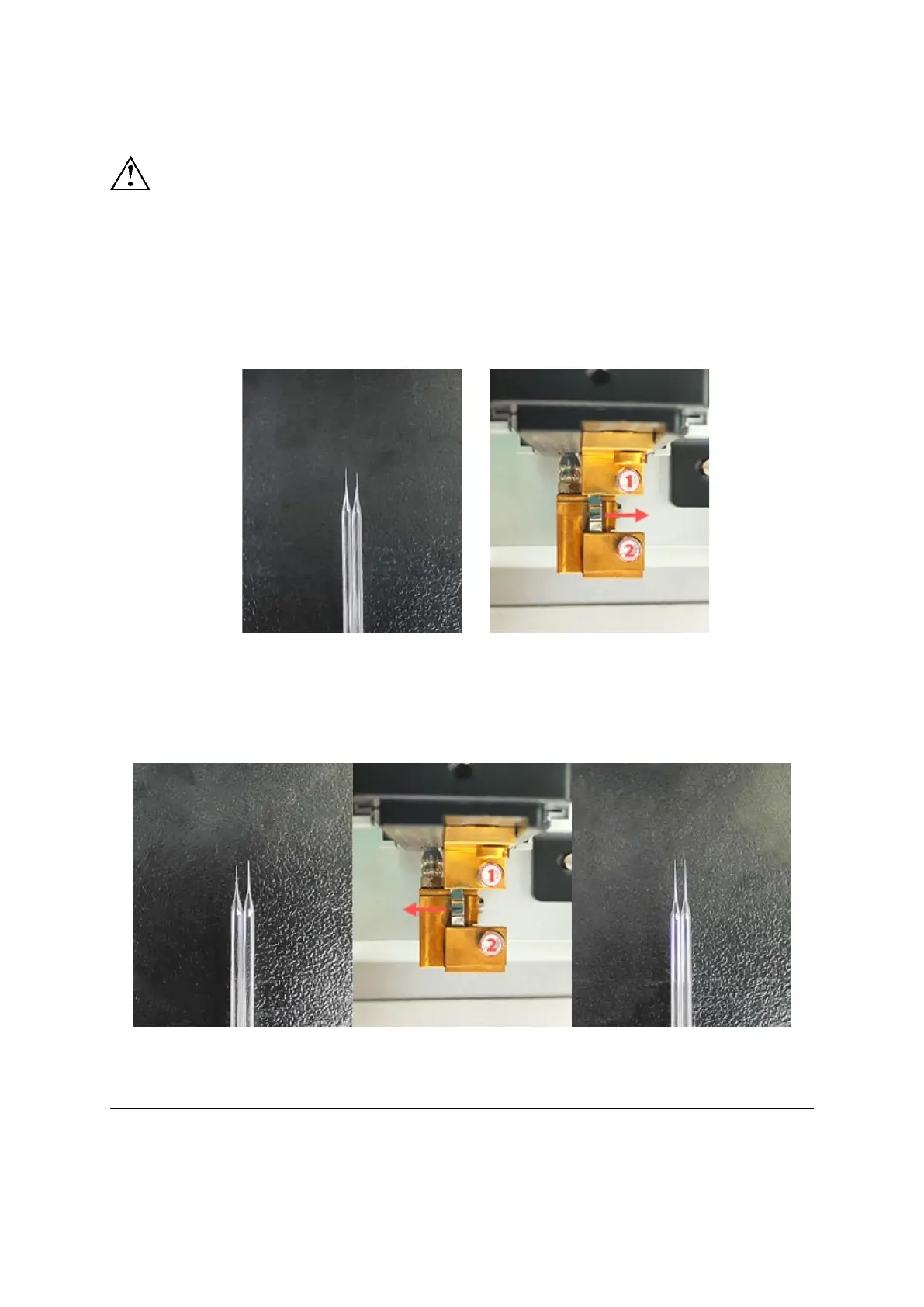 15) If the left tips are shorter than the right one, please loosen the screws ① and ②, and
