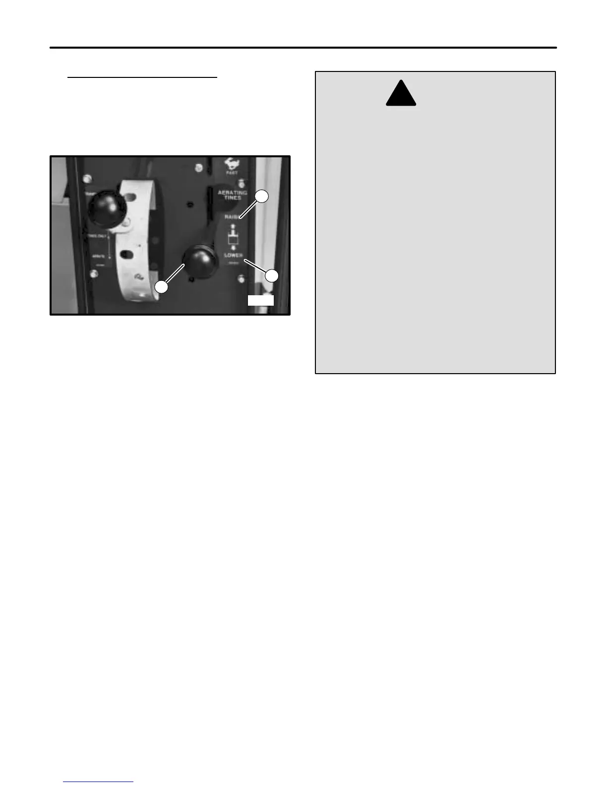 RAISE Hydraulically lifts the tines and turf guard from the