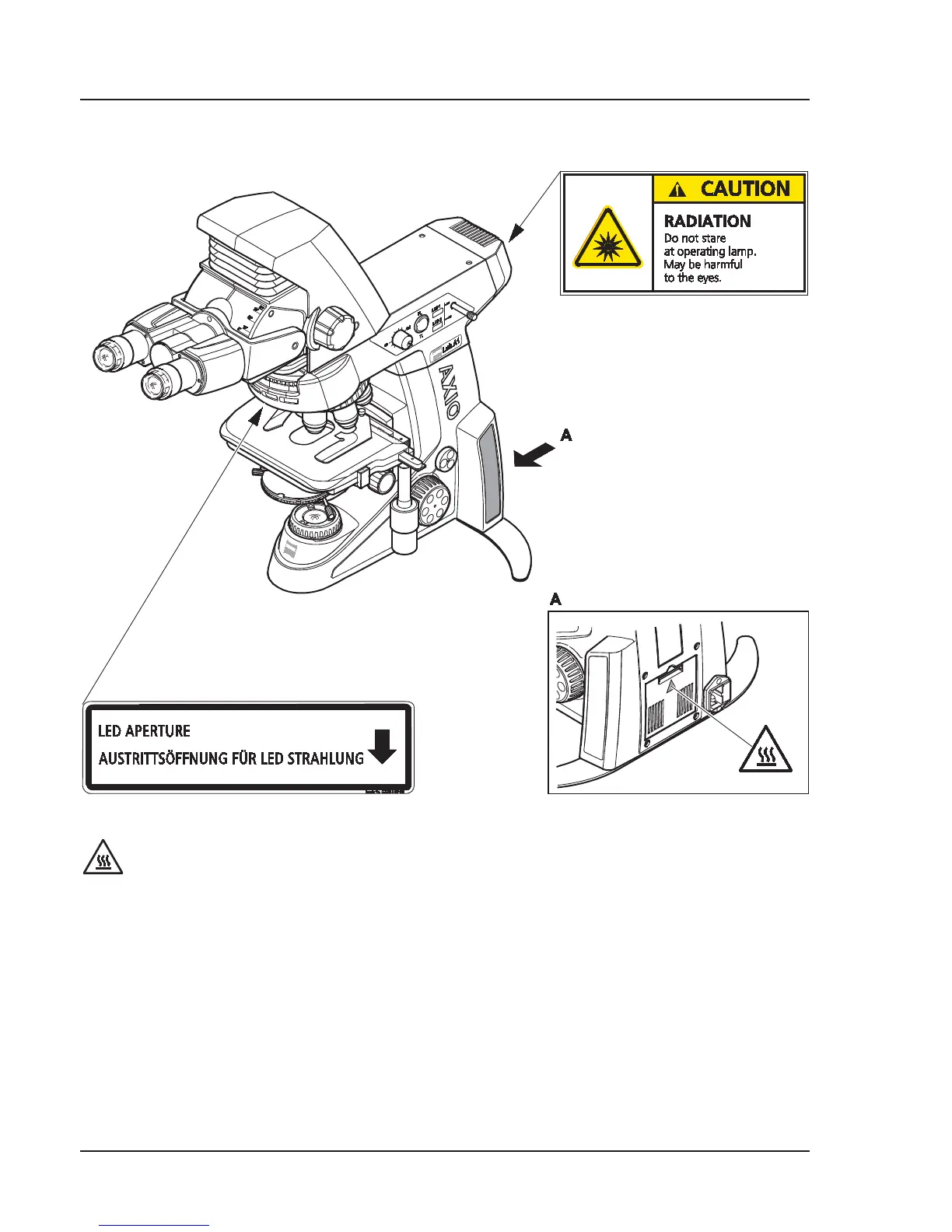Fig. 1-1 "RADIATION" and "LED APERTURE" warning labels on Axio Lab.A1 for transmitted and