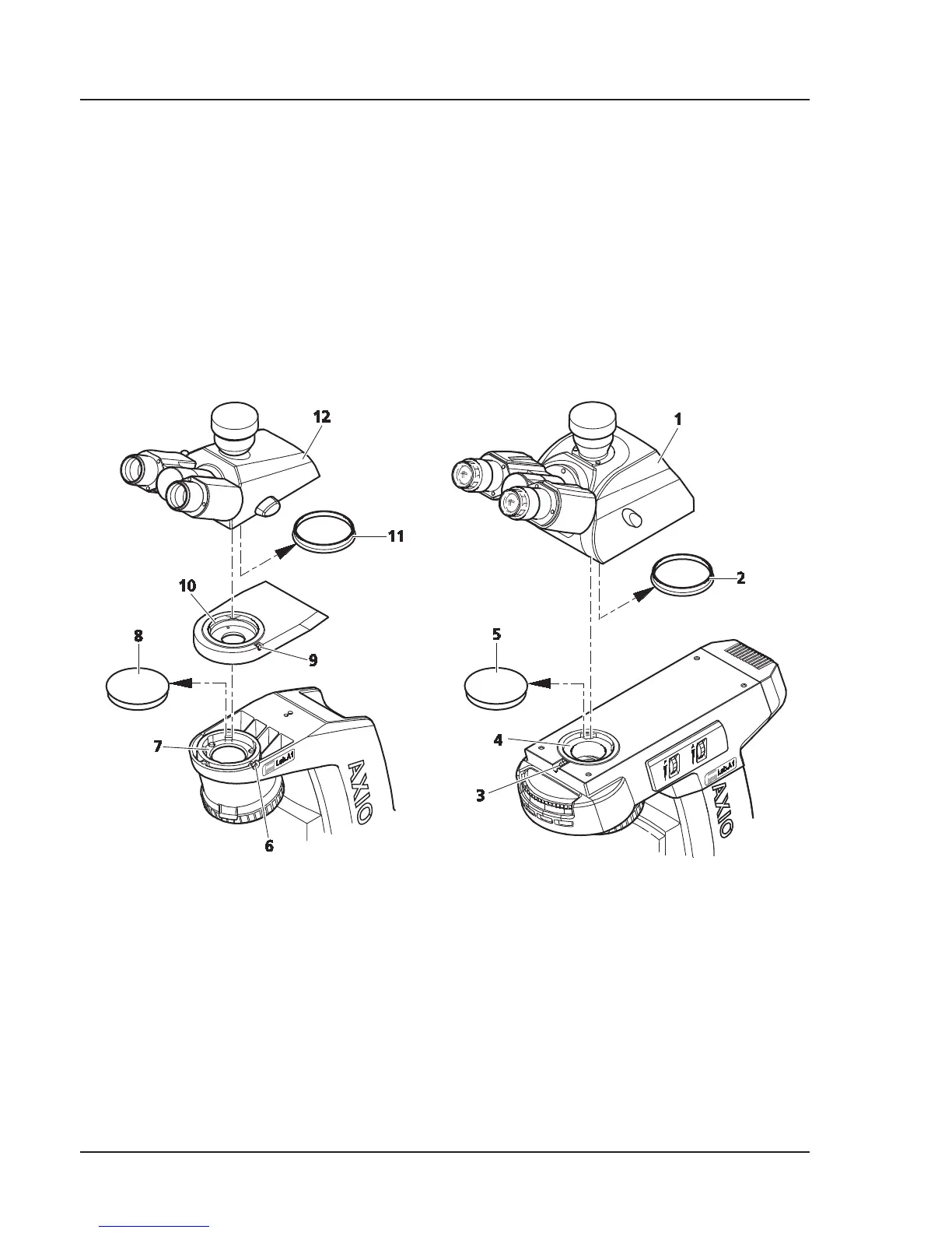 x Insert the binocular tube/photo tube (Fig. 3-5/12) into the intermediate plate, align and tighten the