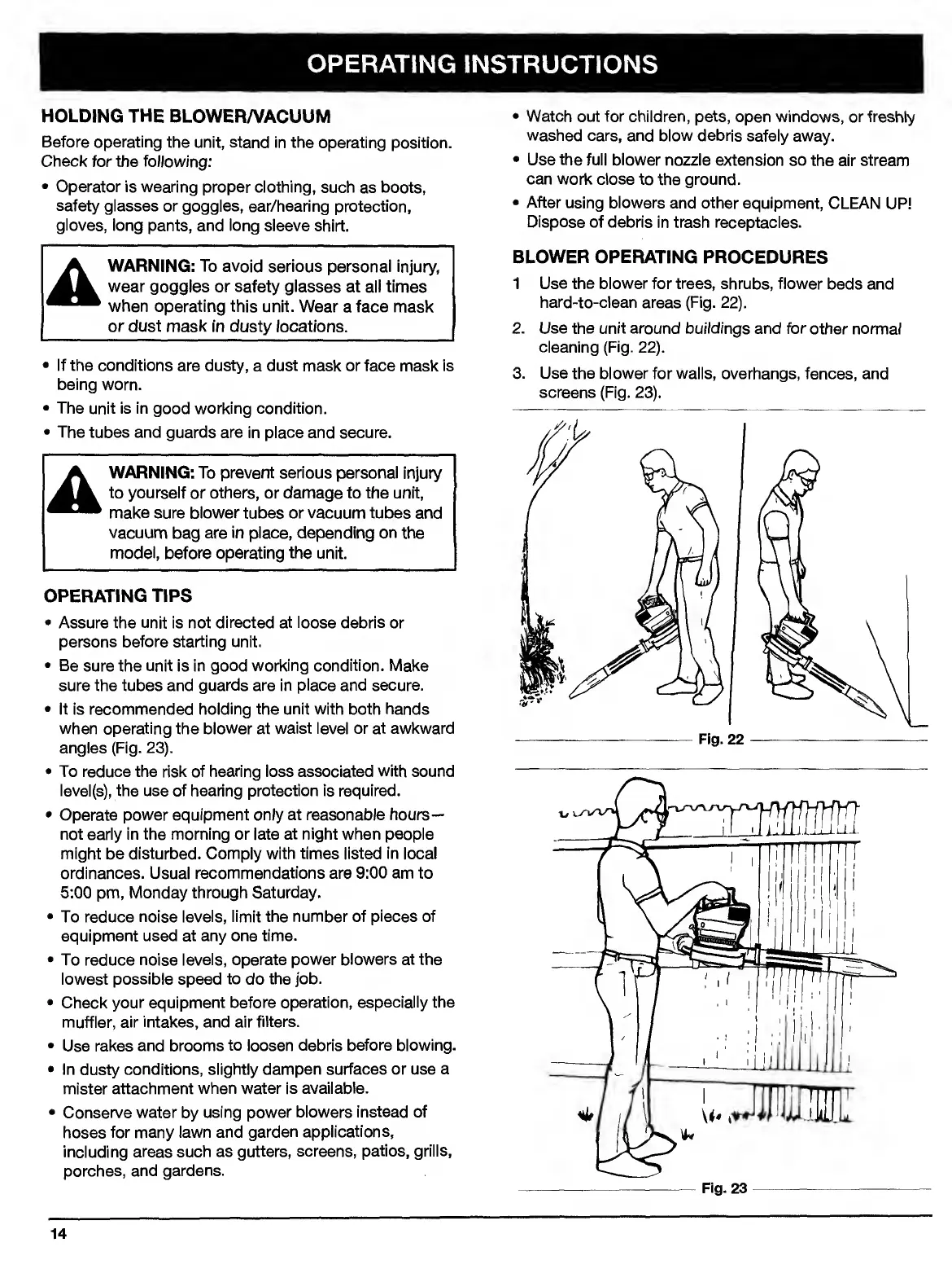 Ryobi 280r - Operating Instructions; Holding the Blower;Vacuum; Operating Tips; Blower Operating Procedures