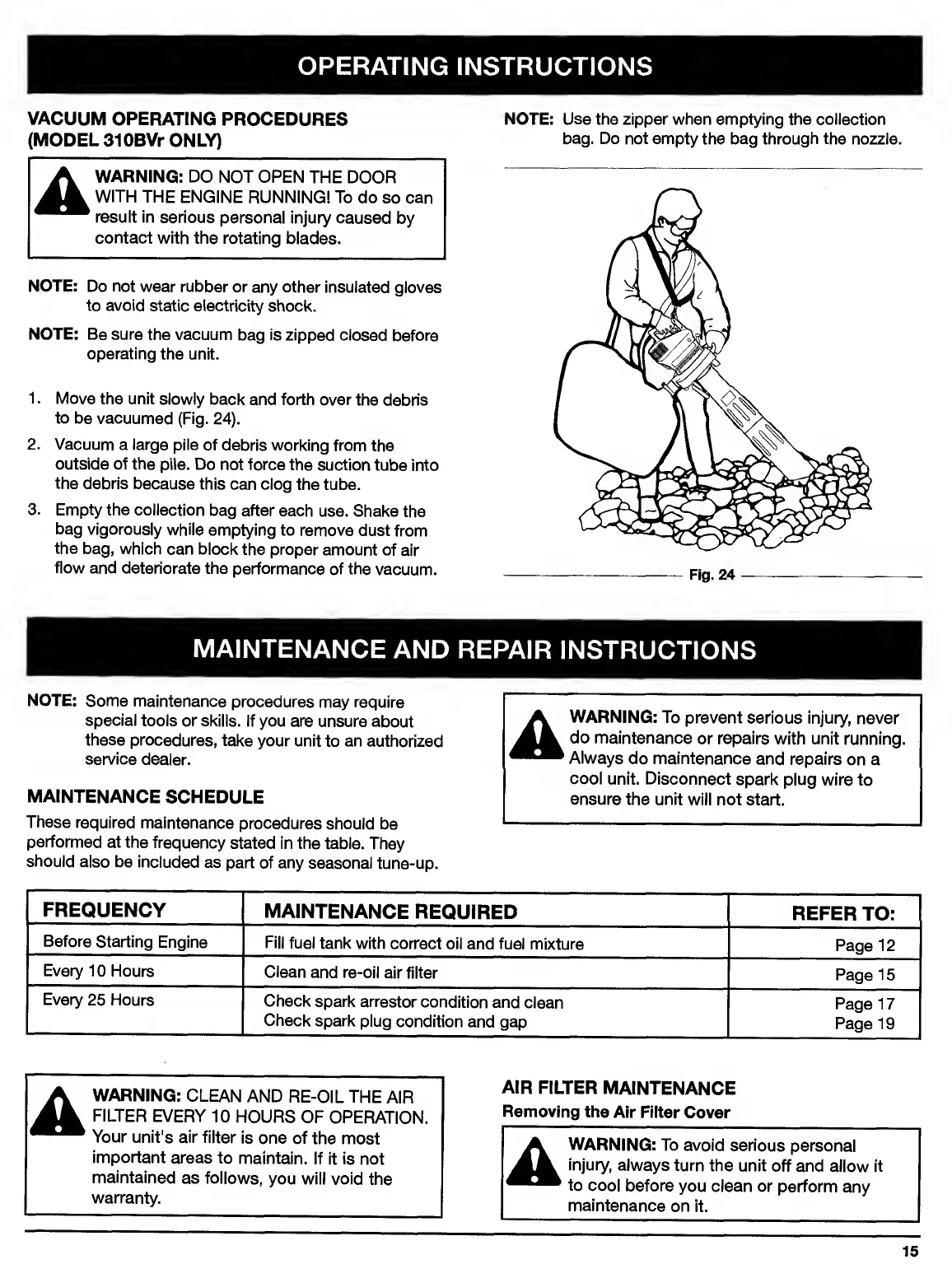 Ryobi 280r - Vacuum Operating Procedures (Model 310 BVr Only); Maintenance and Repair Instructions; Maintenance Schedule