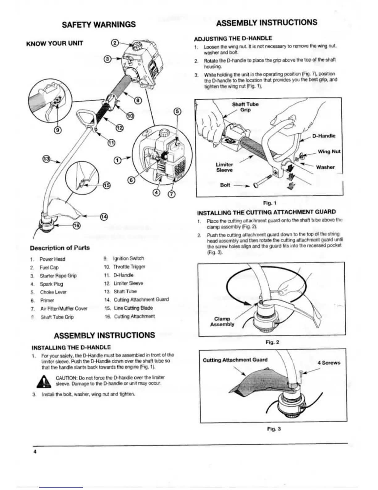 Ryobi 305RT - SAFETY WARNINGS; KNOW YOUR UNIT; ASSEMBLY INSTRUCTIONS; INSTALLING THE D-HANDLE