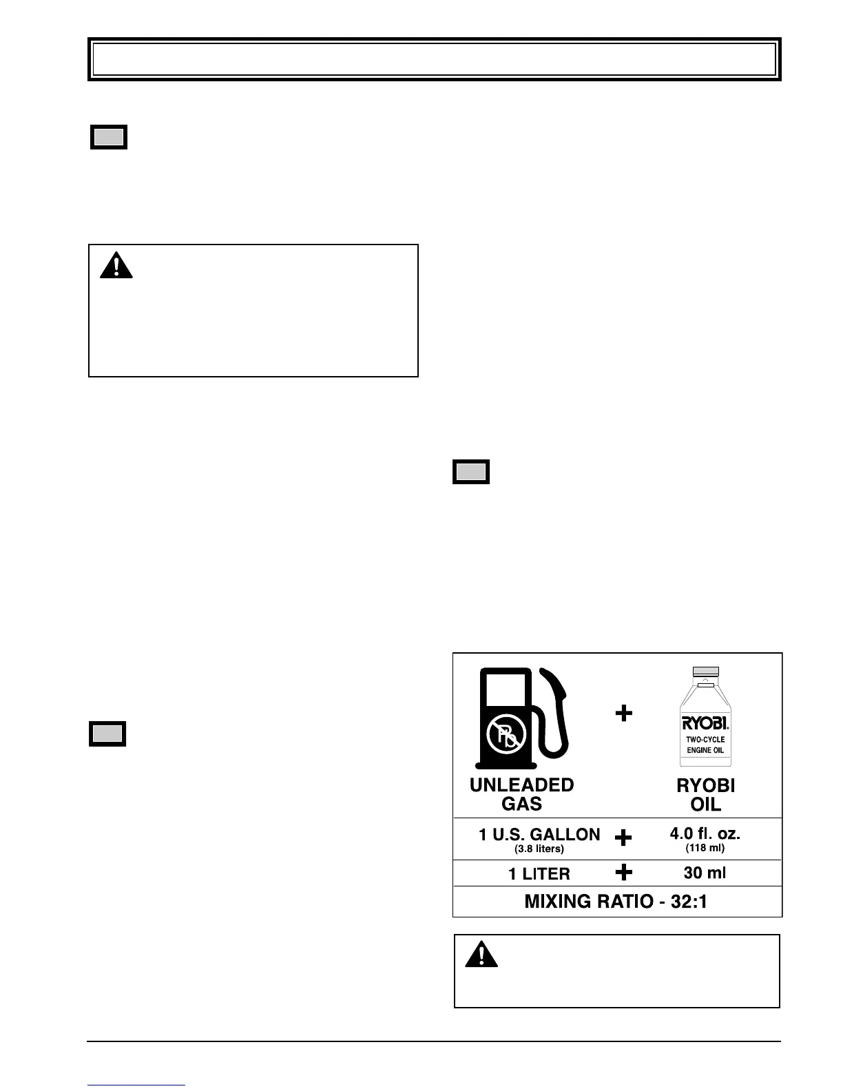unleaded gasoline in a separate fuel can, 32:1. Do not mix